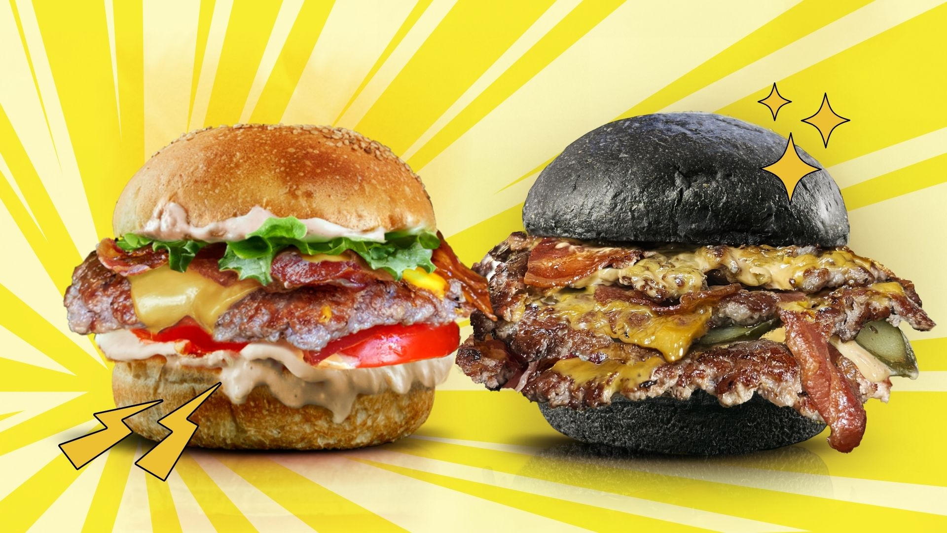 DOPPIO Burger SMASH di Fassona piemontese, morbido pane artigianale al carbone vegetale, doppio strato di cheddar, doppio bacon croccante, cetriolini Bread & Butter, la nostra speciale salsa Burger Hits