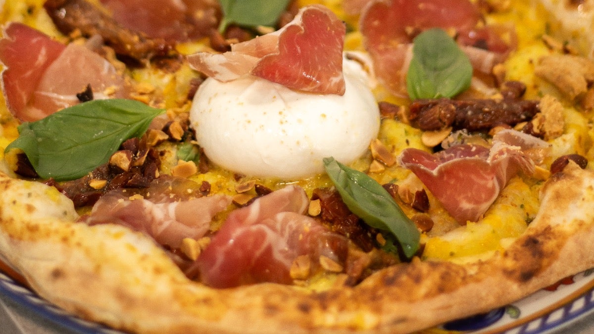 Passata di datterino giallo, capocollo, burratina "Delizie Pugliesi", olive nere denocciolate, tarallo mandorlato, olio EVO, basilico fresco12,00 €Pizza e cor' WINTER EDITION