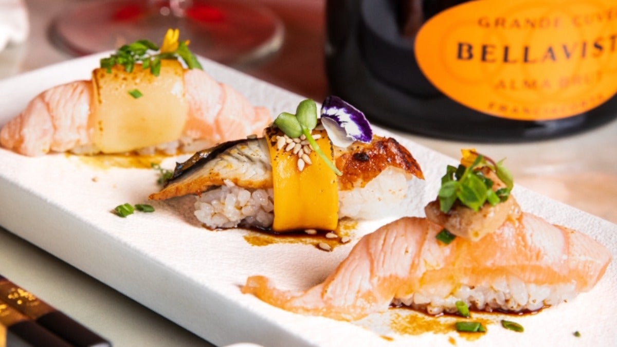 AMAEBI,BRANZINO,WASABI FRESCO,SALSA PONZU,RISO SOFFIATO€7.00R4 RORU ORANGE SAKE-2PZ