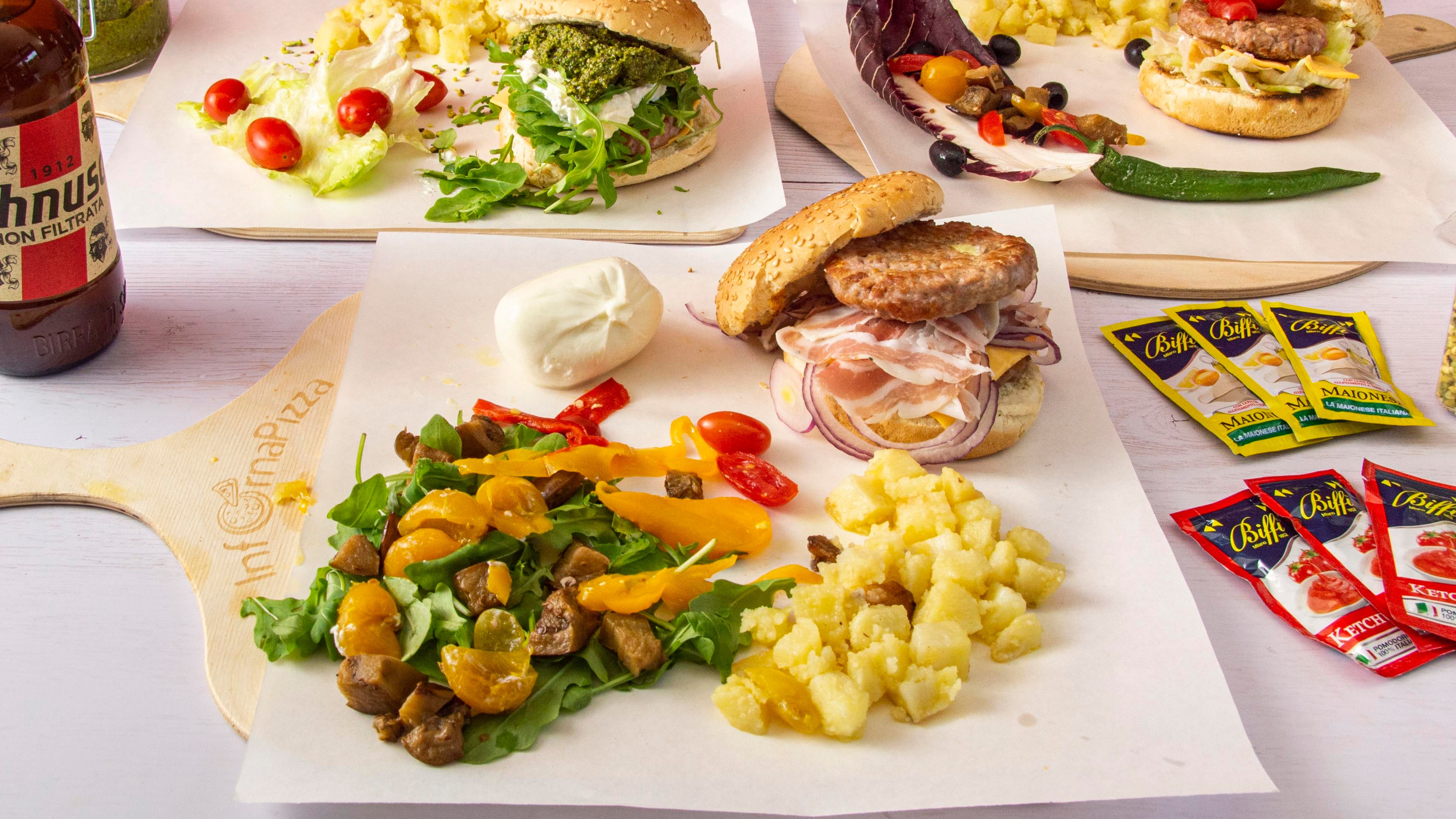 Burger di manzo, cheddar, insalata e pomodoro€6.50Componi il tuo hamburger