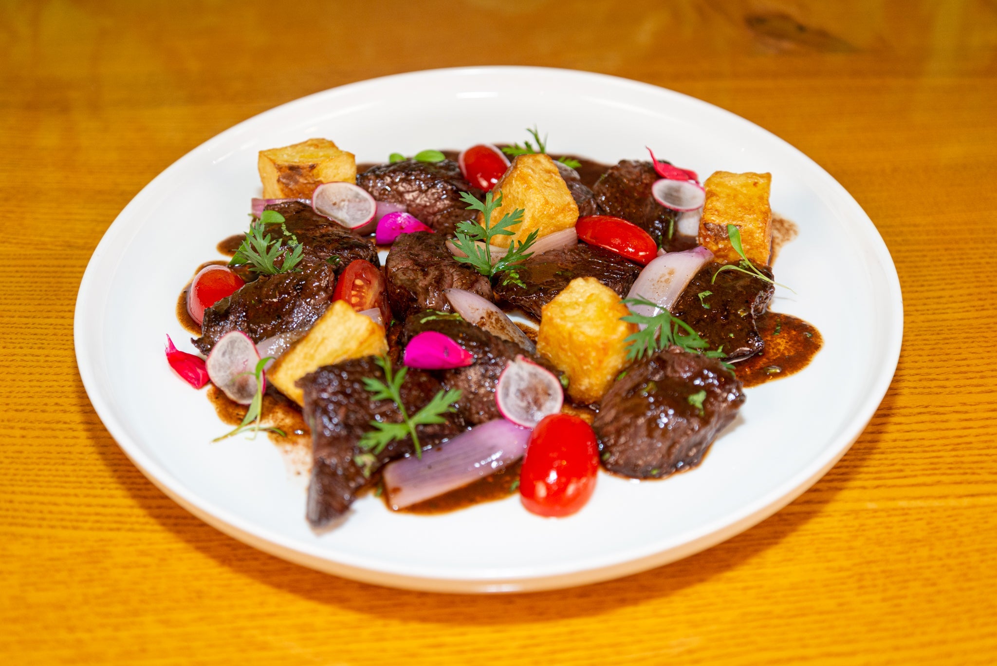 Straccetti di filet mignon saltati in wok, cipolla di Tropea e datterini, riso bianco e patatine fritte fresche