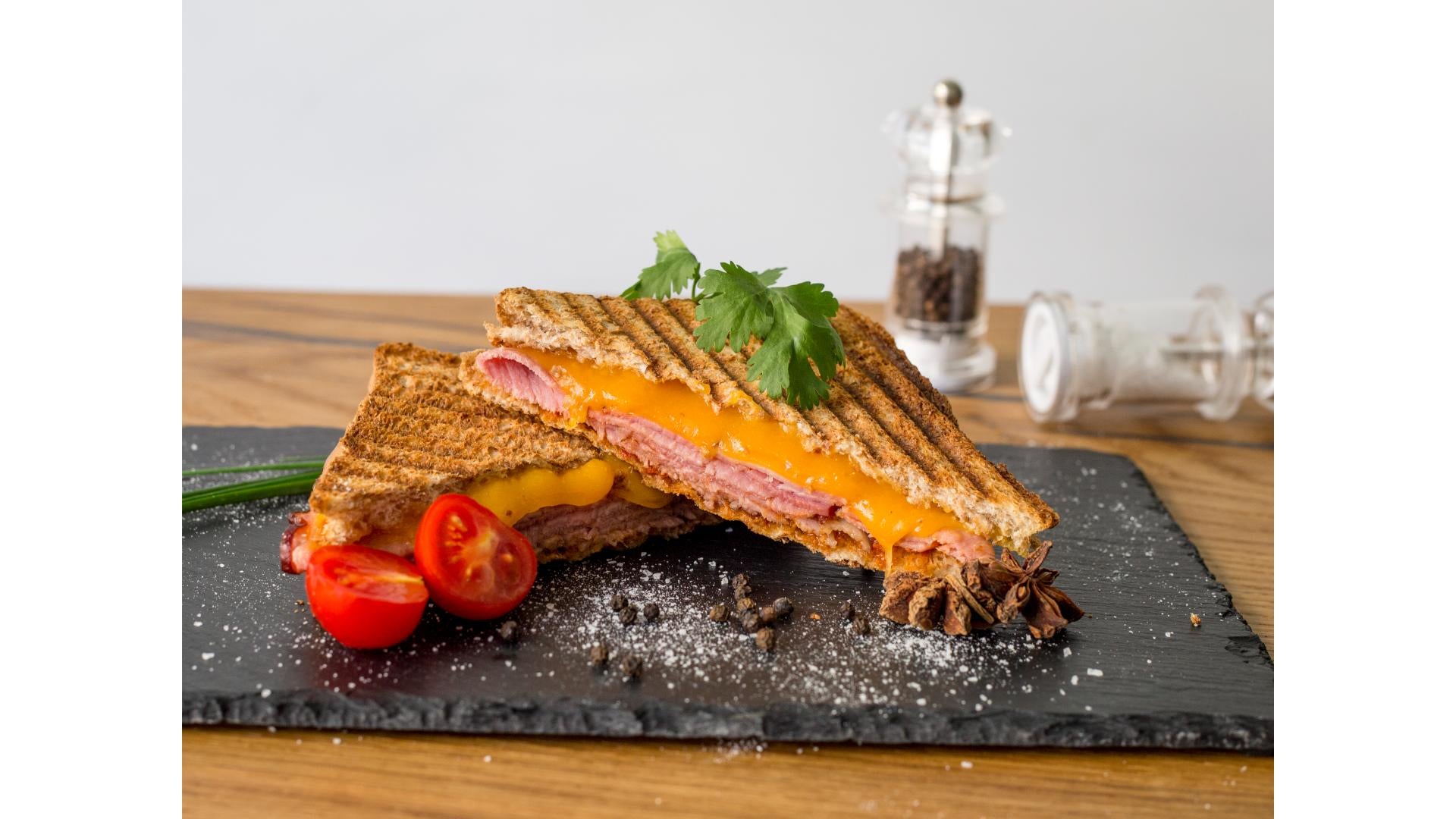 Prosciutto cotto rovagnati, frittata di uova amalgamato con pepe e formaggio, bacon croccante, provola di Agerola, rugola, salsa al pepe nero