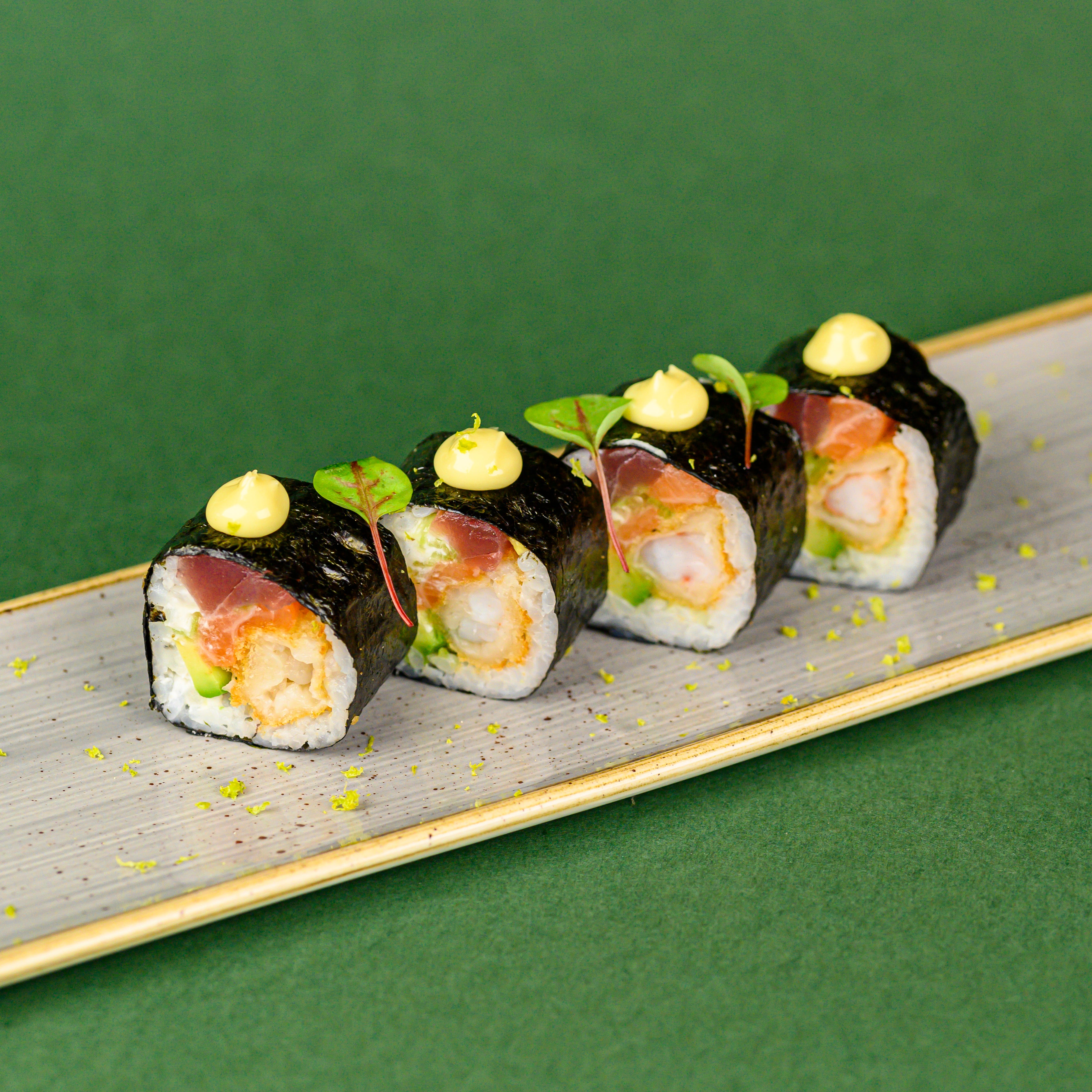 Crepe di soia, riso bianco, ricciola, burratina, avocado, pepe, scaglie di tartufo nero fresco, lime e teriyaki20,80 €Futomaki fritto