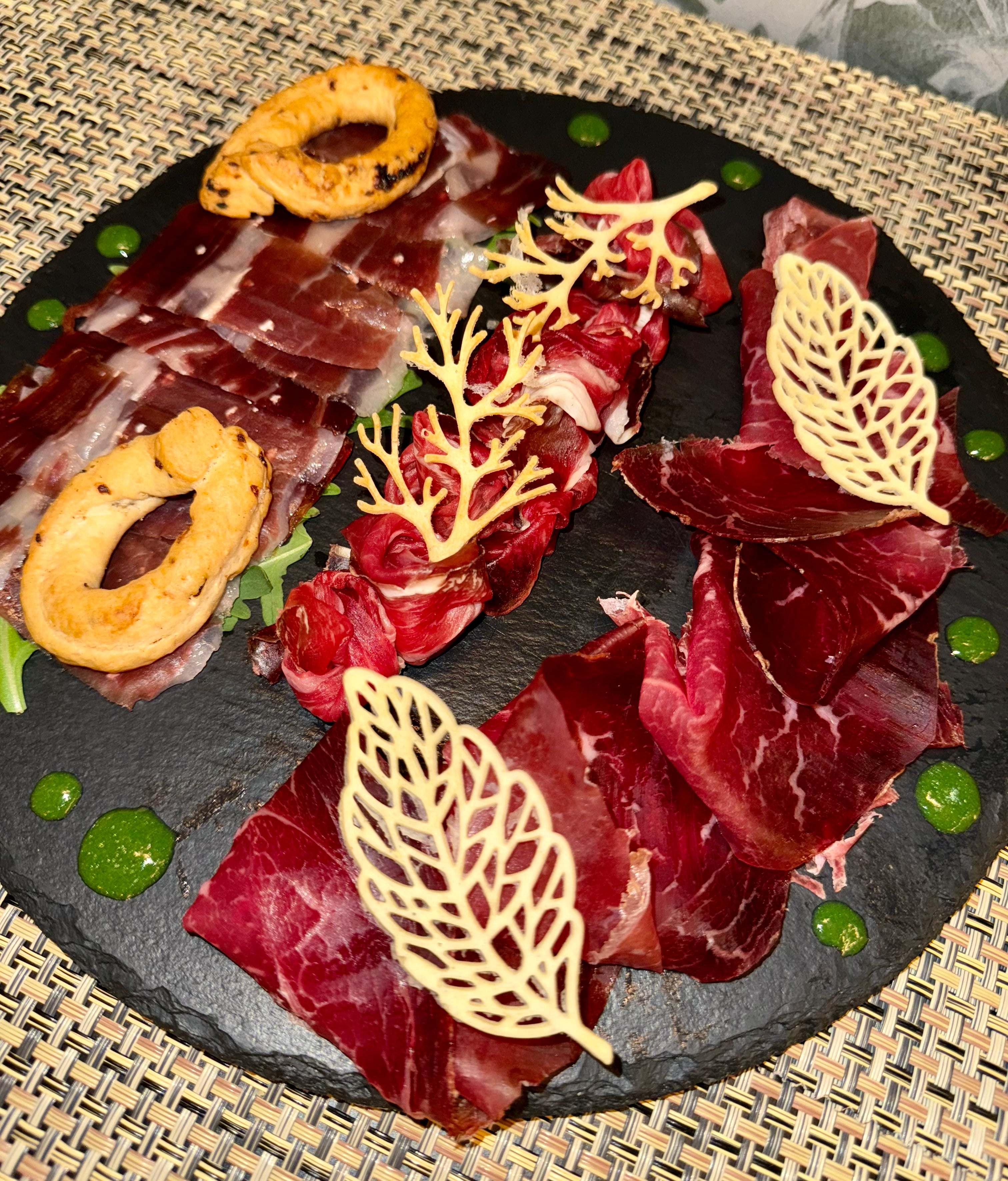 Carpaccio di manzo, maionese al prezzemolo e guanciale14,00 €Carpaccio, zucchine alla scapece e mandorle