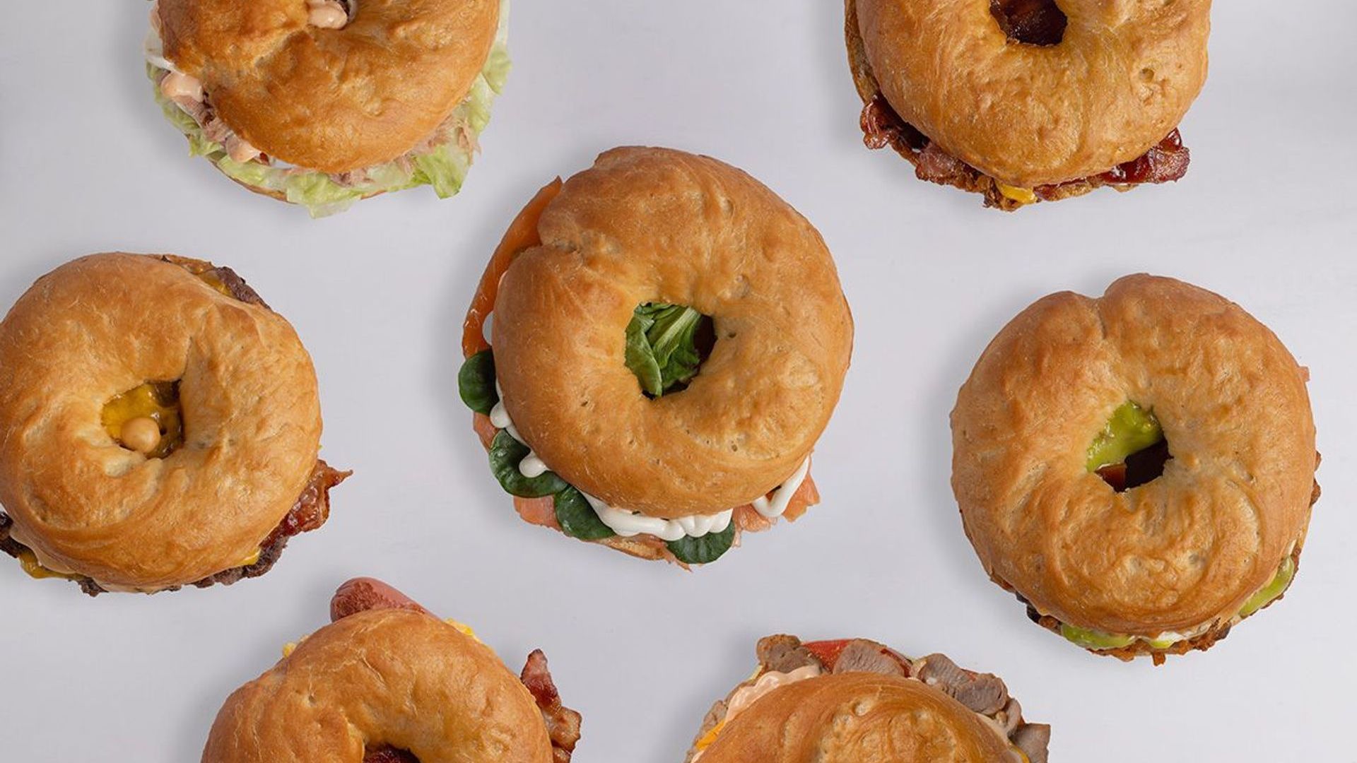 Bagel classico, hamburger di bovino, cheddar, bacon, crispy onion, cetriolini, lattuga, pomodoro e salsa burger€18.35