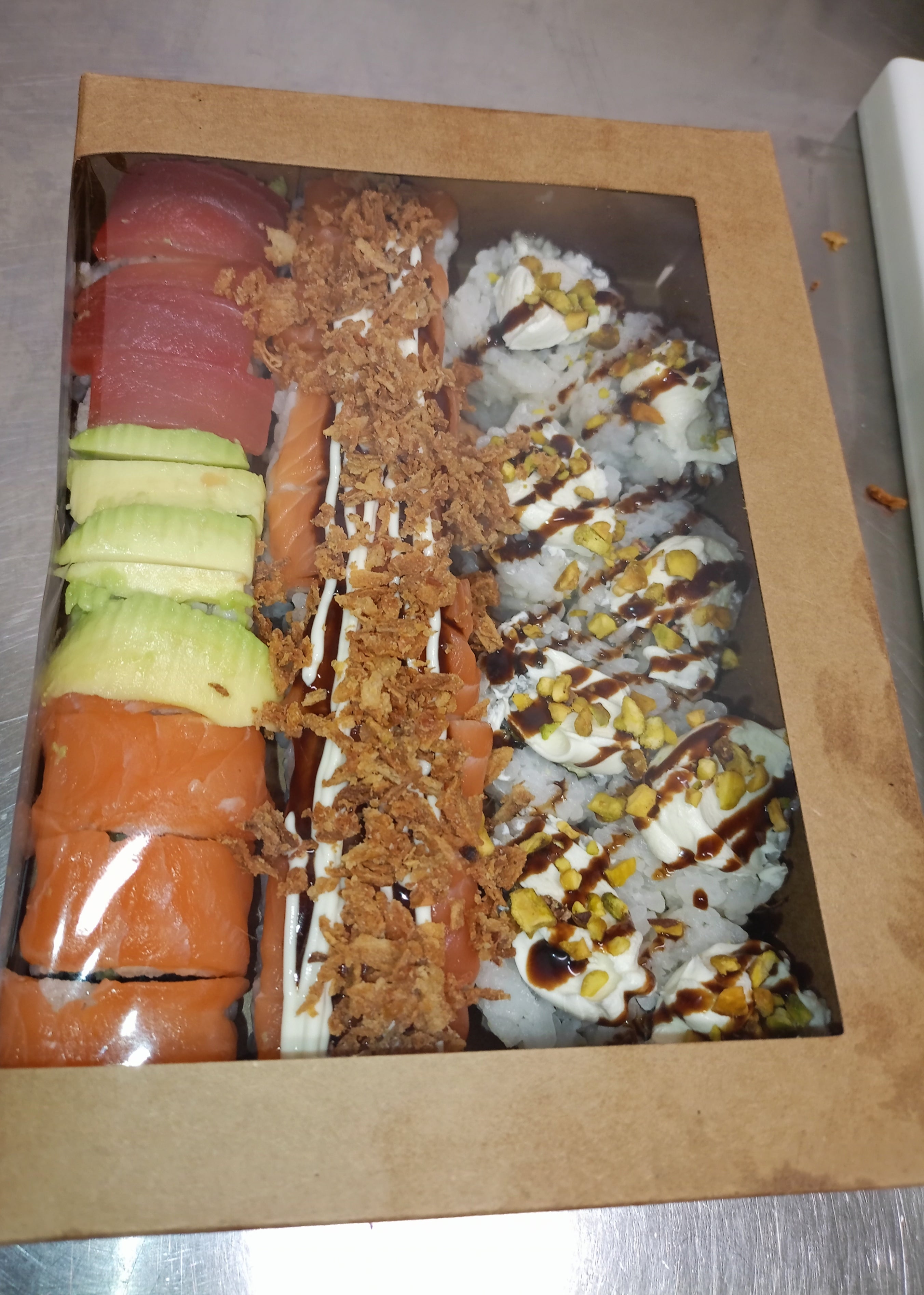 Dragon crunch 8 pezzi, 8 pezzi philadelphia pistacchio, 4 pezzi salmon crunch, 2 nigiri salmone, 2 nigiri salmone salsa spicy teriyaki pistacchio, 1 temaki salmone